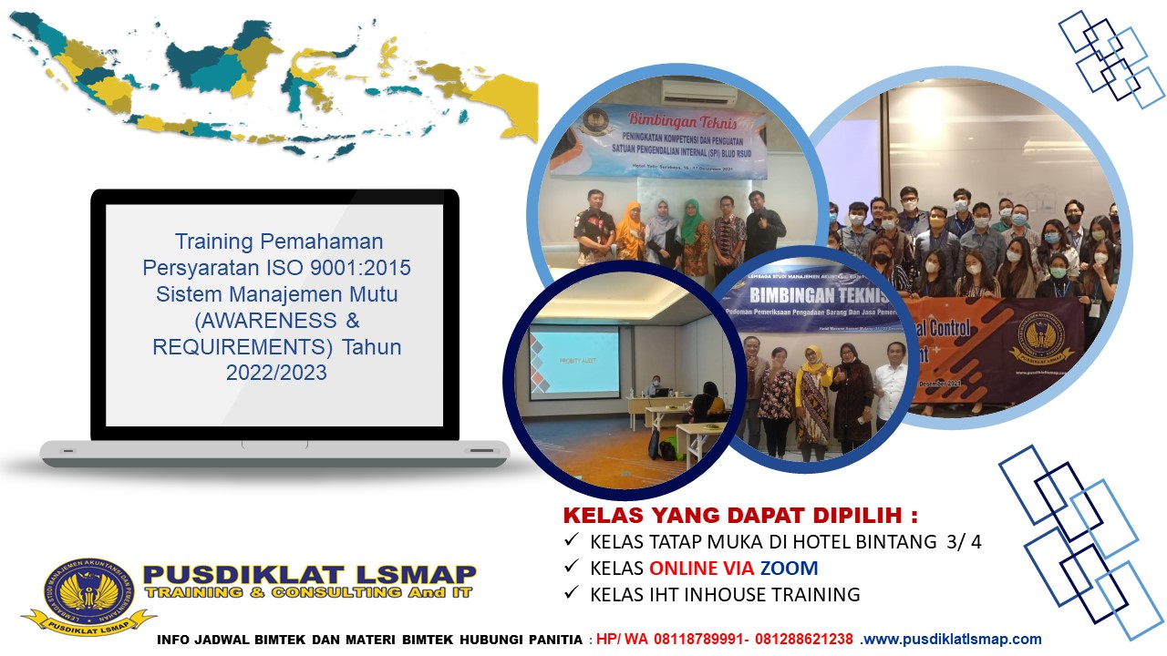 Untuk Memehami Opsi Di Atas Maka Kami Lembaga Studi Manajemen Akuntansi Dan Pemerintahan Bersama Para Pakar dan Narasumber Brerpengalaman Selama 20 Tahun Lebih Akan Melaksanakan Tentang Info Training Pemahaman Persyaratan ISO 9001:2015 Sistem Manajemen Mutu (AWARENESS & REQUIREMENTS) Tahun 2022/2023 Tanggal : Informasi Jadwal dan Tanggal Pelaksanaan Silahkan klik dan Download https://www.pusdiklatlsmap.com/download-jadwal/